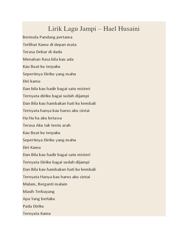 . Lirik Lagu Jampi Hael Husaini. Lirik Lagu Jampi Hael Husaini. Cikza pulak yang letih dengar hari-hari pergi kerja duk ulang nyanyi lagu ni.